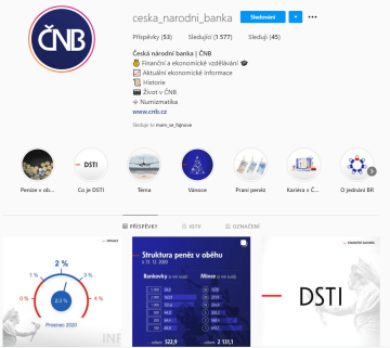 Česká národní banka má ve svých rezervách okolo 9 tun zlata. Hodnota takové zásoby může značně přesahovat i 10 miliard korun. Dost pravděpodobně je tedy s jistou nadsázkou ČNB nejbohatší český influencer na Instagramu. Drahá auta a večírky na jachtách ale ve stories nečekejte. Právě formát stories je na profilu ČNB to nejlepší. Stories jsou obsahově velmi zajímavá a hezky zpracovaný je i jejich archiv.
