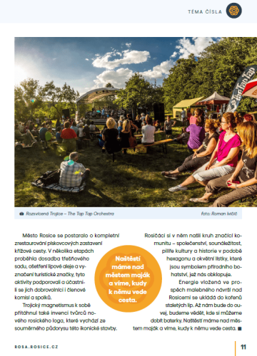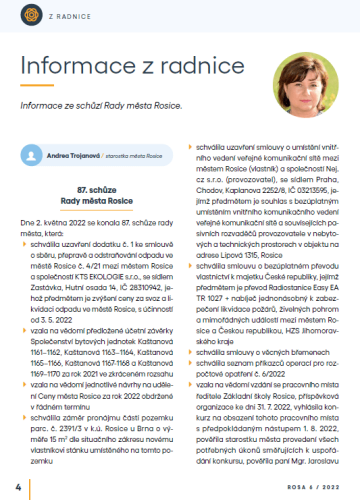 ROSA je zpravodaj jihomoravských Rosic, který vychází v třítisícovém nákladu. Na začátku roku 2022 prodělal kompletní redesign, který toto periodikum vizuálně sjednotil v ostatními komunikačními kanály radnice. Ta kromě zpravodaje a webových stránek používá také Facebook, Instagram, newsletter a klasický městský rozhlas. Přečtěte si, jak hodnotíme vítěze soutěže Radniční listy roku 2022 v kategorii měst od 2 do 10 tisíc obyvatel.