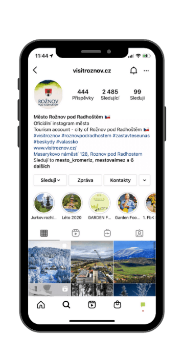Profilový obrázek je pojat originálně ve formě sloganu. Při procházení feedu je ale text v profilovém obrázku nečitelný, což mu mírně ubírá na eleganci. Trochu lépe vyhrát by se dalo i se sekcí "bio", která je každému novému followerovi na očích jako první, a bylo by fajn ji trochu oživit například emotikony. Je škoda, že již poměrně rozsáhlý archiv stories nemá graficky zpracované ikonky (inspirace: @kutnahora, @discover_kadan a další).