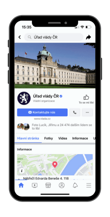 Na Facebooku Úřad vlády zprostředkovává víceméně stejné informace, jako na Twitteru, ale s odlišným výsledkem. Sociální síť Facebook v případě Úřadu vlády potvrzuje, že co se týká politického přesvědčení jeho českých uživatelů, je odlišný od Twitteru i Instagramu. Dle dat společnosti NapoleonCat, která nám poskytla údaje o reakcích (formou emotikonů) na příspěvky Úřadu vlády za poslední 2 měsíce, je patrná určitá odlišnost od ostatních sociálních sítí. Úřad u příspěvků nechává diskuzi plynout, nezasahuje do ní, je nicméně možné, že v souvislosti s válkou na Ukrajině maže xenofobní příspěvky. O tom ale údaje nemáme. Účet na Facebooku má necelých 25 tisíc sledujících a na rozdíl od ostatních sítí nepoužívá zkratku @strakovka, ale @uradvlady. Účtu na Facebooku bychom doporučili nový úvodní obrázek, současný působí nevýrazně.