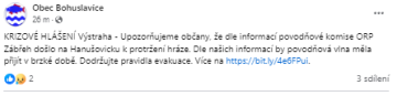 Jeden z mnoha smutných momentů - obec Bohuslavice tímto příspěvkem oznámila bleskovou povodeň, která během hodiny nečekaně zaplavila velkou část obce.