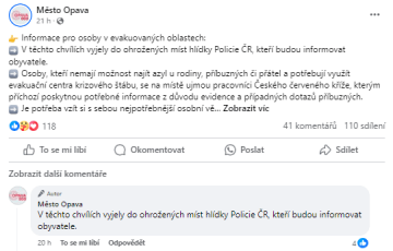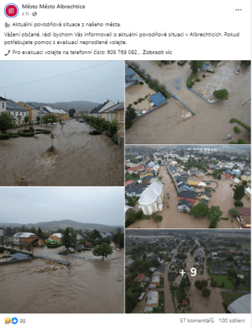 Příkladem je Opava, která patří k nejpostiženějším městům, ve kterém probíhala evakuace několika tisíc obyvatel. Město denně publikuje příspěvky, které informují o aktuální situaci, tvoří přehledné mapky evakuačních bodů, natáčí aktuální reportážní videa a odpovídá na komentáře s dotazy o situaci v jednotlivých ulicích a oblastech.