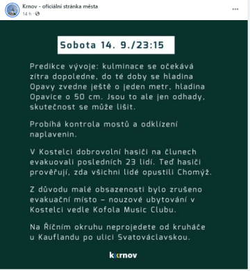 Město Krnov patří taktéž mezi zasaženou oblast. Pro komunikaci na sociální síti volí velmi přehlednou grafiku.