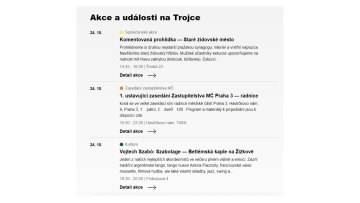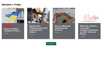 Praha 3 je důkladná i při výběru obrázku k článkům, výpis aktualit tak též působí na první pohled příjemně a profesionálně (mimo jiné je to i jednotnou filtrací barev fotek). Následuje textový výpis Důležitých informací, včetně sympatické perokresby odkazující na jednu z dominant Prahy 3. Následuje slideshow s odkazy a logy projektů Prahy 3 - i zde je třeba zmínit cit pro detail, kdy každý projekt městské části má logo ve stylu vizuální identity. Na celé homepage prakticky nenajdeme jediný prvek, který by z nastaveného grafického stylu jakkoli vybočoval, a to včetně log. Následuje modul s výpisem akcí z kalendáře, který je doplněn o velkou fotografii s pohledem z dronu. Landing page je zakončena přehledem kontaktů a patičkou s odkazy na sociální sítě.