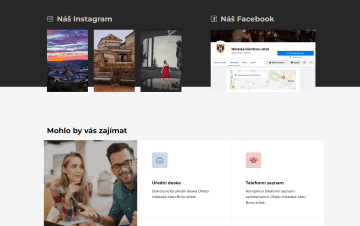Pod karuselem se nachází výpis aktualit a tiskových zpráv - ve velmi příjemném minimalistickém designu, je dbáno na čistotu, miminum rozdělovníků, tabulek, linek - výsledek je perfektní a bohužel je to skutečně něco, co velcí rozšíření dodavatelů městských webů ne vždy umí. Týká se to i prací s formátem dlouhé landing page - tento formát vyžaduje cit, například rozdělovat textové moduly grafickými či fotografickými prvky - proto na tomto webu výpis aktualit střídá linka s náhledem fotografií z IG a FB. Skvělý nápad a opět hezky designováno. Banner Portál občana (níže) má zbytečně příliš komprimovanou fotografii, jinak ale opět velmi hezká část včetně příjemných ikonek. Výrazná patička také působí moderně.